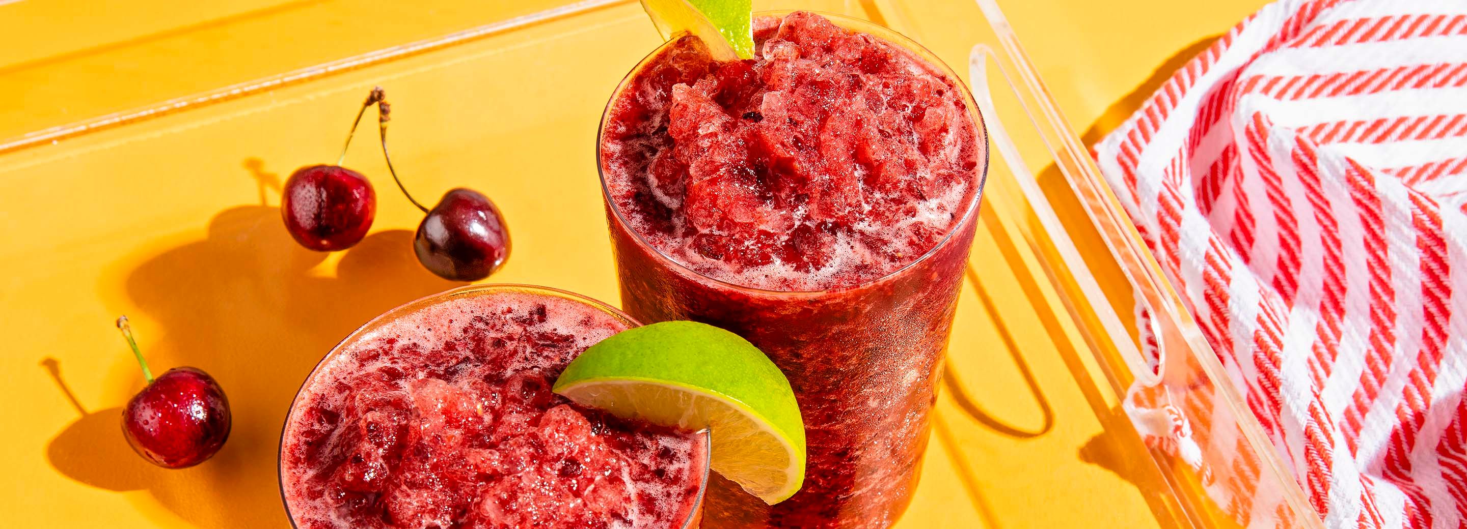 - In a blender, combine lime zest and juice, cherry limeade sparkling water and frozen cherries; cover and blend until smooth. Once desired consistency is reached add ice and frozen berries; blend until mixture is combined and ice is crushed.