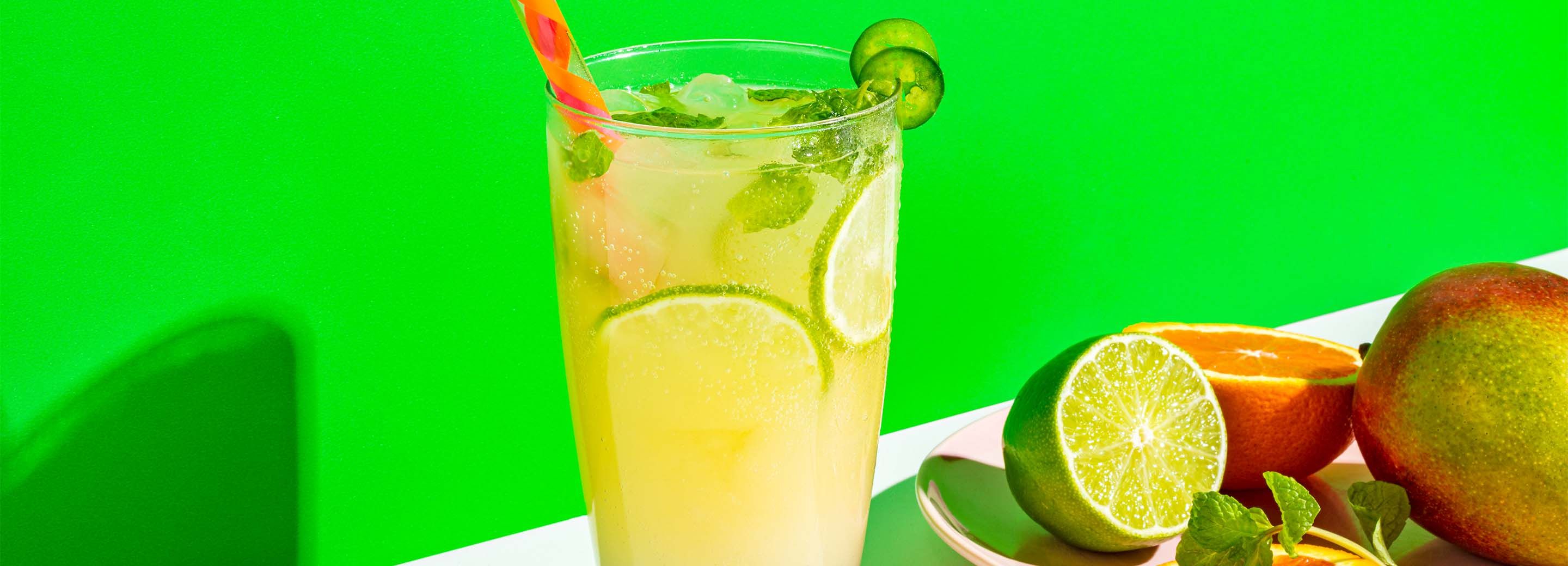 - Split can of orange mango Spindrift between glasses. Top with coconut water and garnish with fresh jalapeño slices if desired.