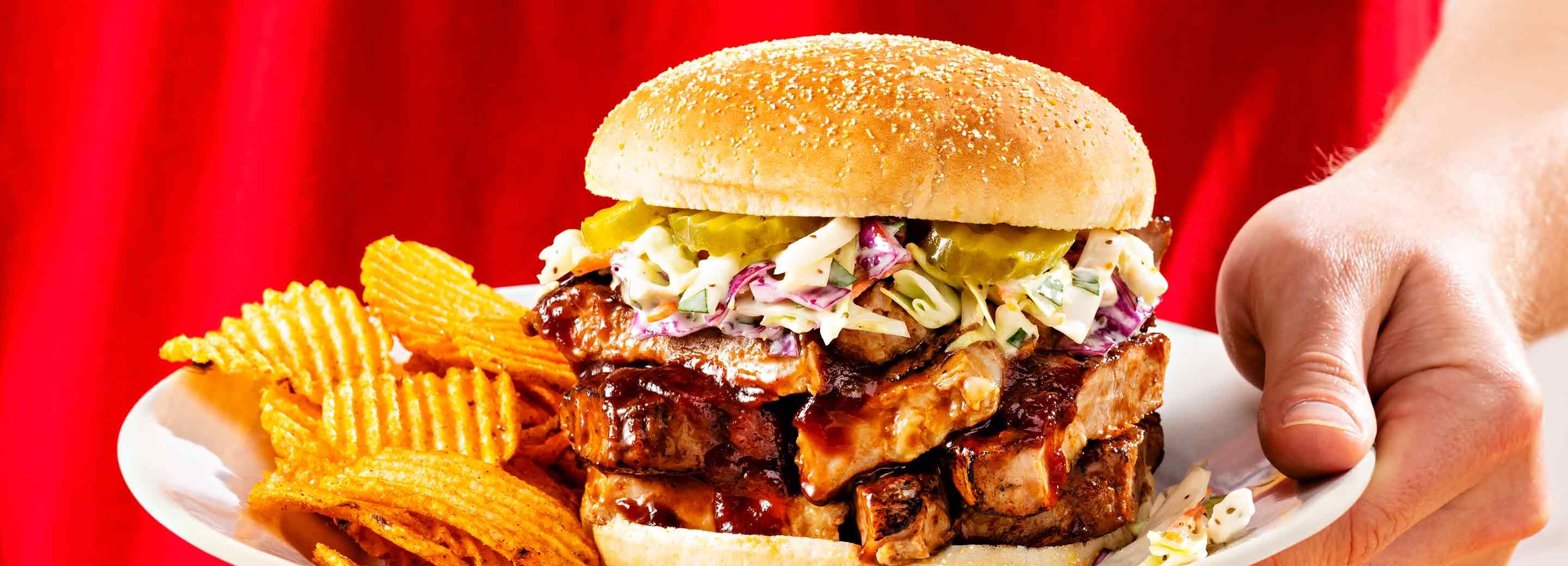 - Toss pork steak slices in barbecue sauce and evenly distribute among bottom buns.